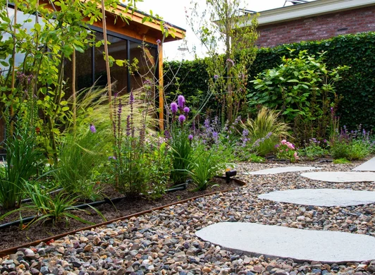 Resultaat: Naadloze integratie van aanbouw en hovenierswerk.