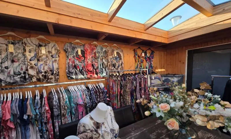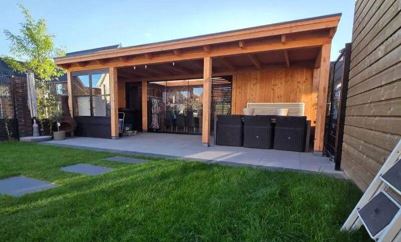 Een maatwerk overkapping waarin nu een kledingwinkel gevestigd is